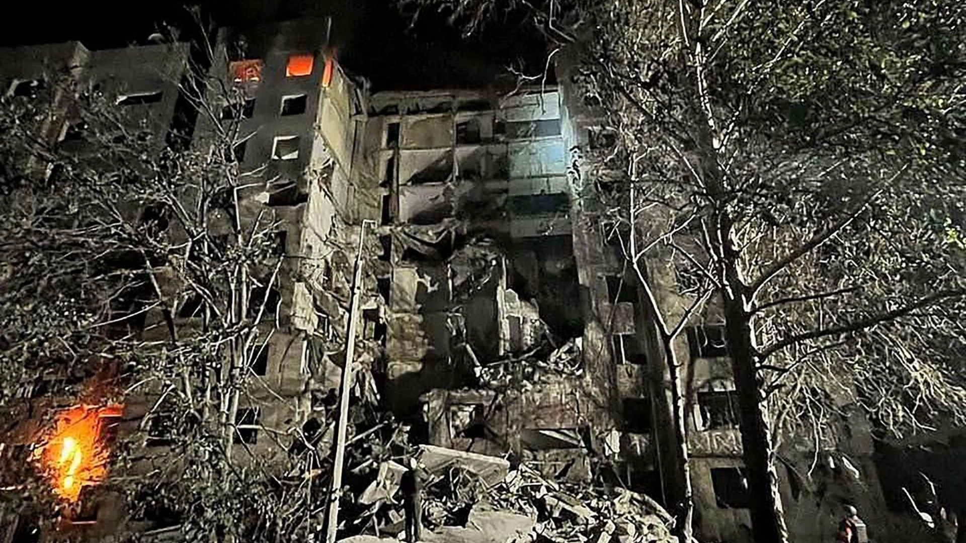 Gaisro pažeisto pastato šiukšlės Zaporizhzhia mieste, Ukrainoje.